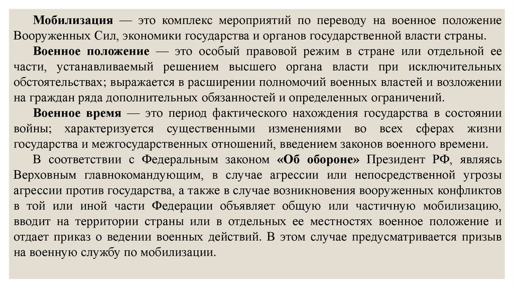 Мобилизация — это комплекс мероприятий по переводу на военное положениеВооруженных Сил, экономики государства и органов государственной власти страны.