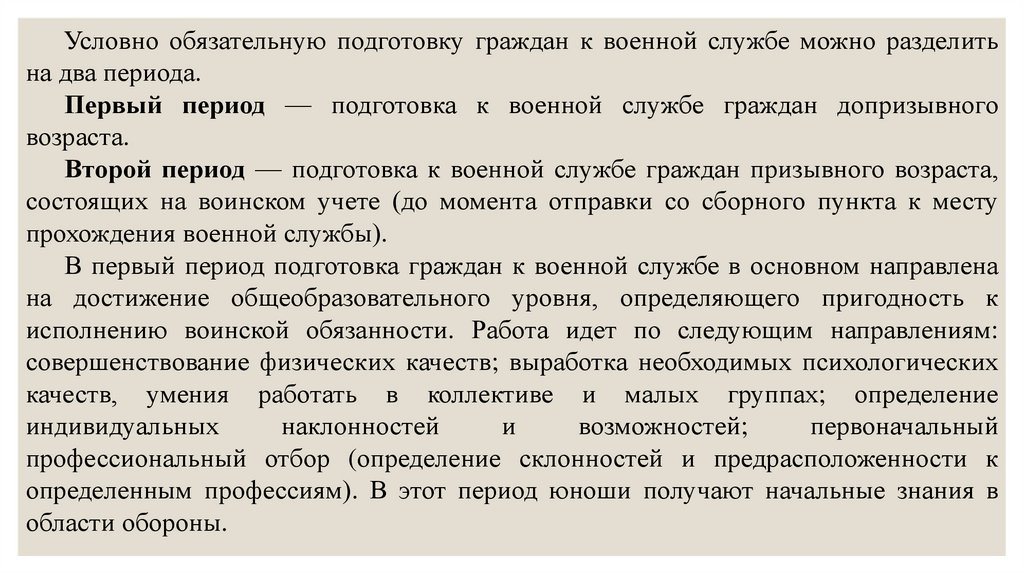 Условно обязательную подготовку граждан к военной службе можно разделитьна два периода.