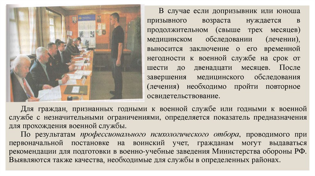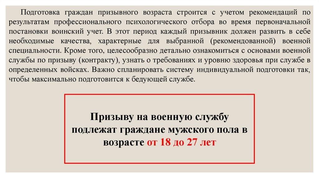 Подготовка граждан призывного возраста строится с учетом рекомендаций порезультатам профессионального психологического отбора во время первоначальной