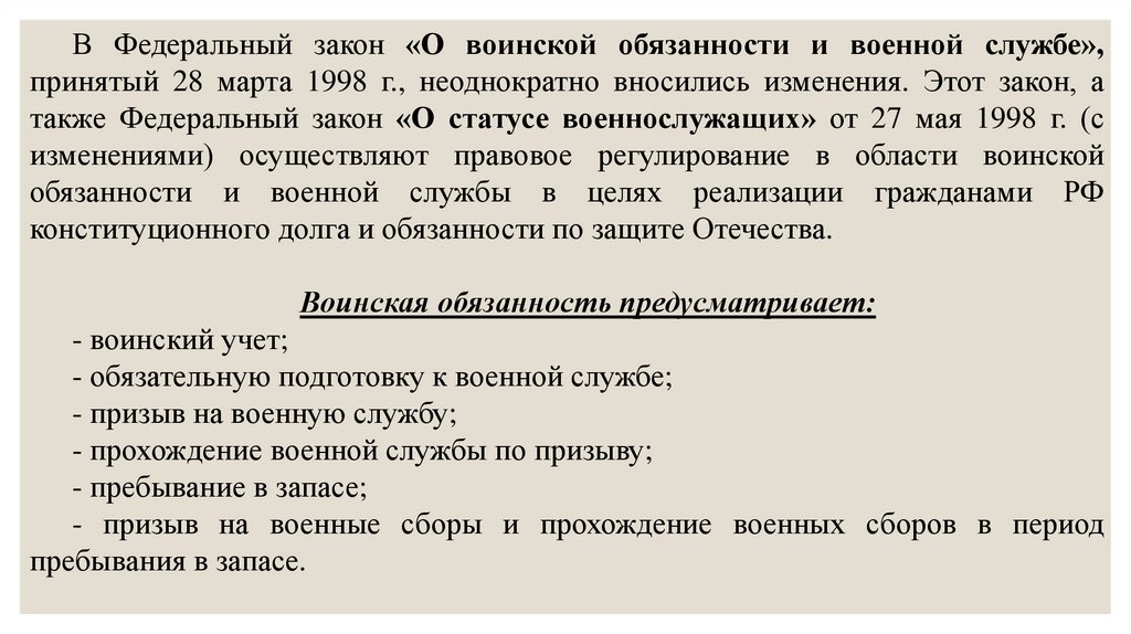 В Федеральный закон «О воинской обязанности и военной службе»,принятый 28 марта 1998 г., неоднократно вносились изменения. Этот закон, а