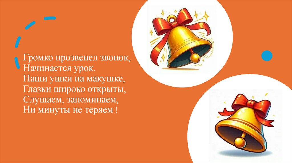 1. Громко прозвенел звонок, Начинается урок. Наши ушки на макушке, Глазки широко открыты, Слушаем, запоминаем, Ни минуты не