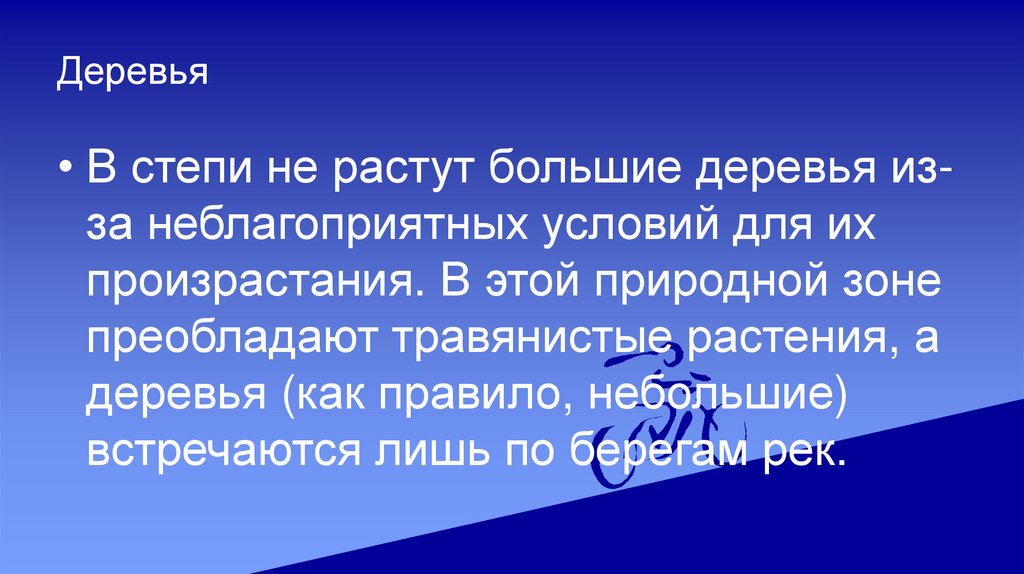 Деревья• В степи не растут большие деревья изза неблагоприятных условий для их
