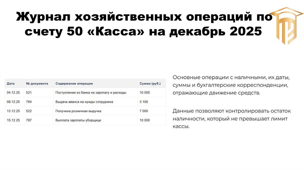 Журнал хозяйственных операций посчету 50 «Касса» на декабрь 2025