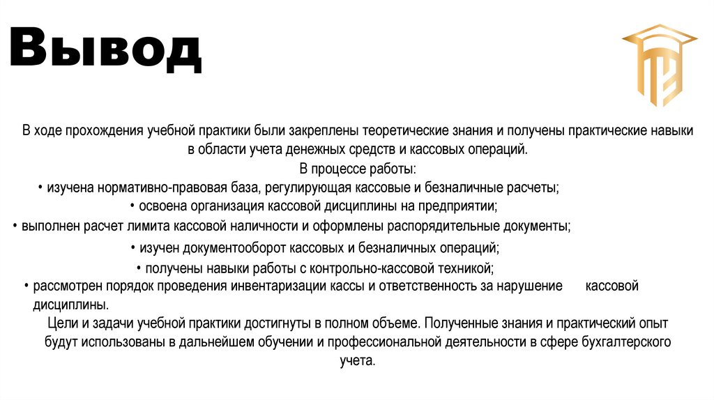 • изучена нормативно-правовая база, регулирующая кассовые и безналичные расчеты;