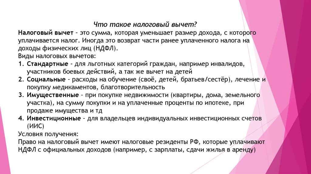 Что такое налоговый вычет?Налоговый вычет – это сумма, которая уменьшает размер дохода, с которого