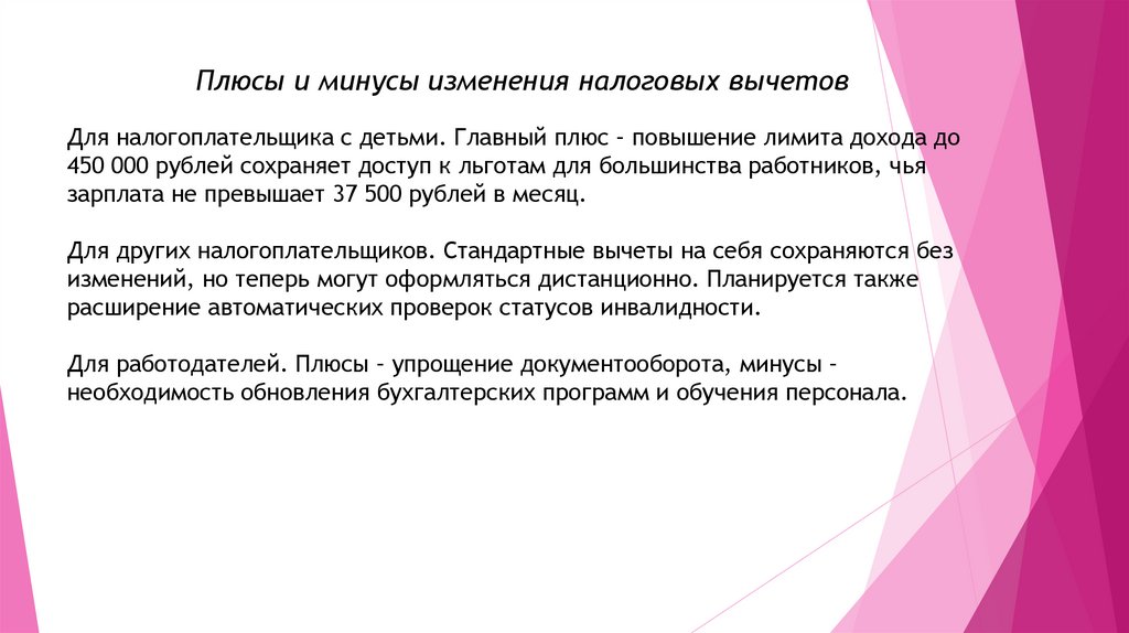 Плюсы и минусы изменения налоговых вычетовДля налогоплательщика с детьми. Главный плюс – повышение лимита дохода до