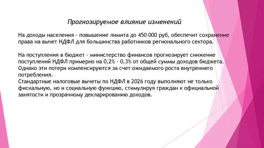 Прогнозируемое влияние измененийНа доходы населения – повышение лимита до 450 000 руб, обеспечит сохранение