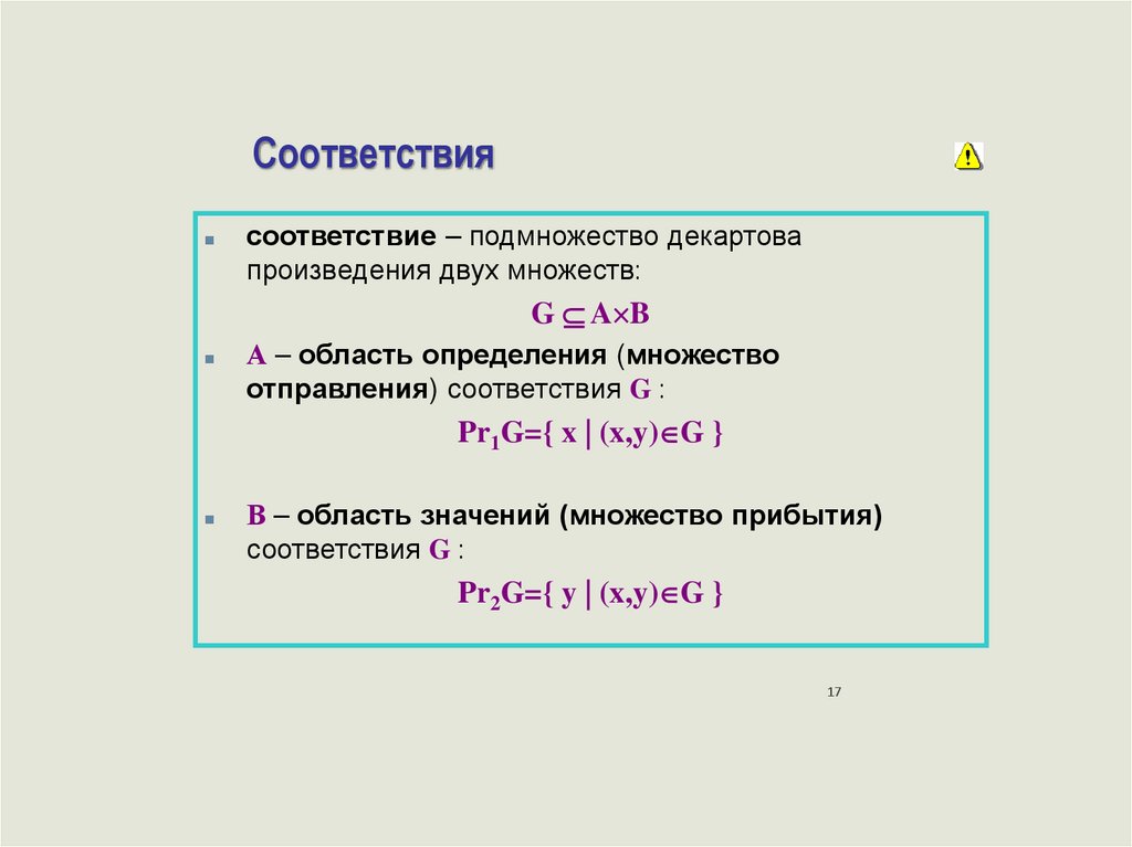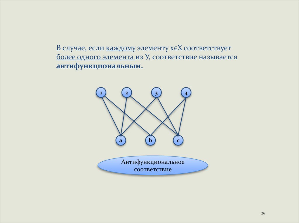 В случае, если каждому элементу хϵХ соответствуетболее одного элемента из У, соответствие называется