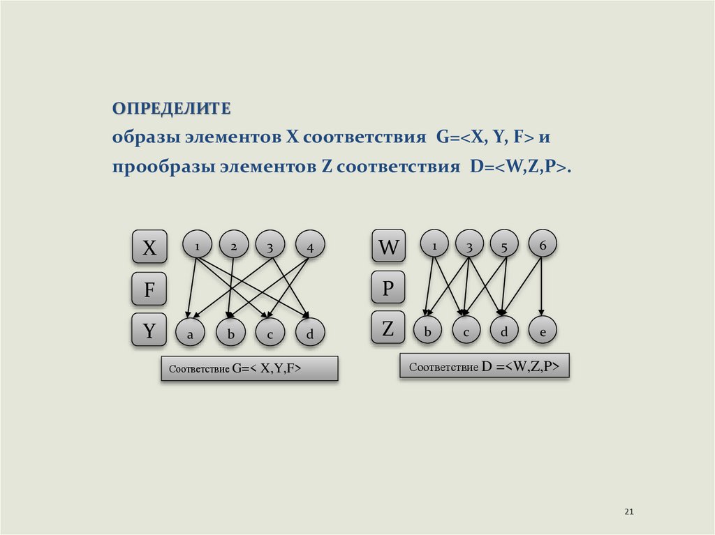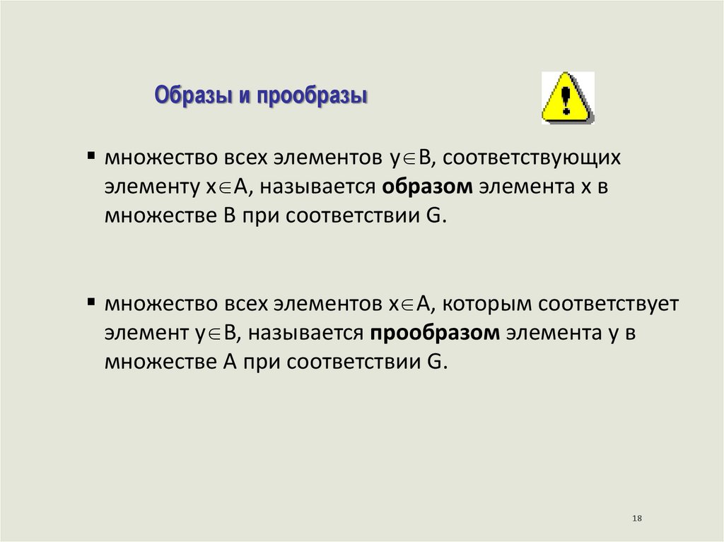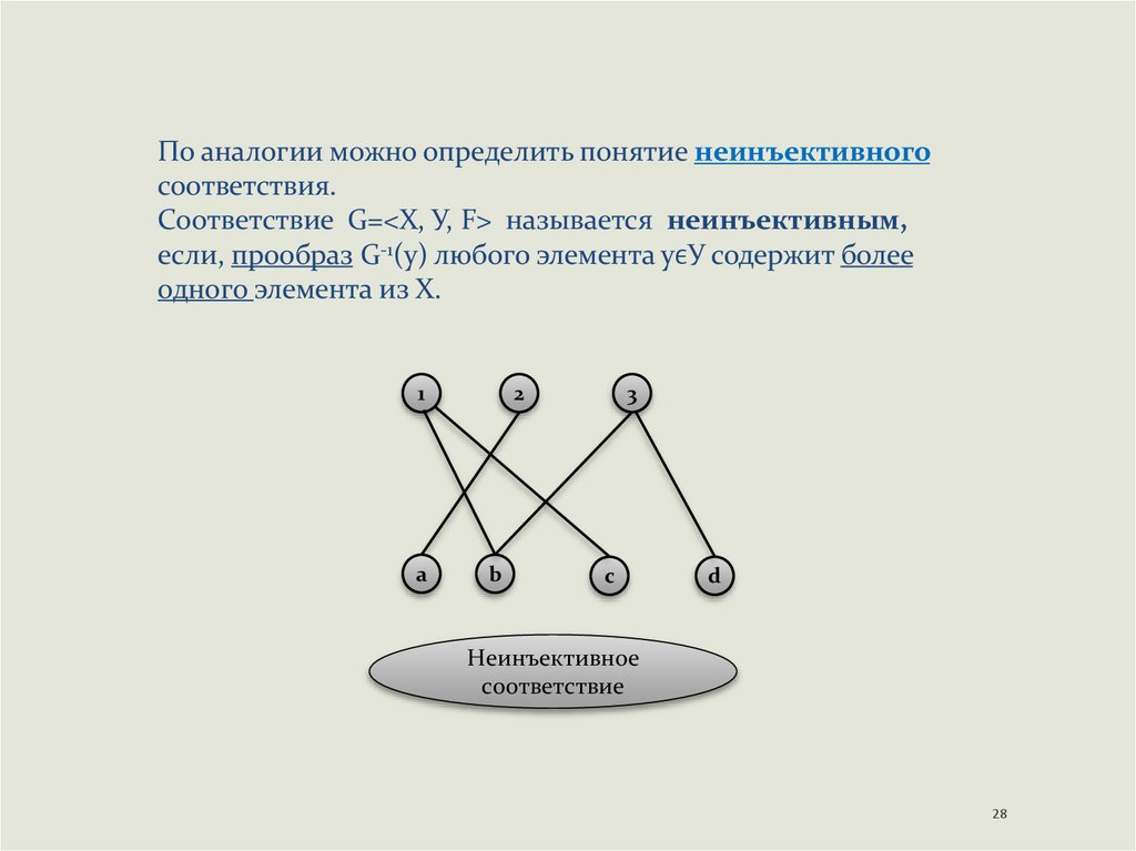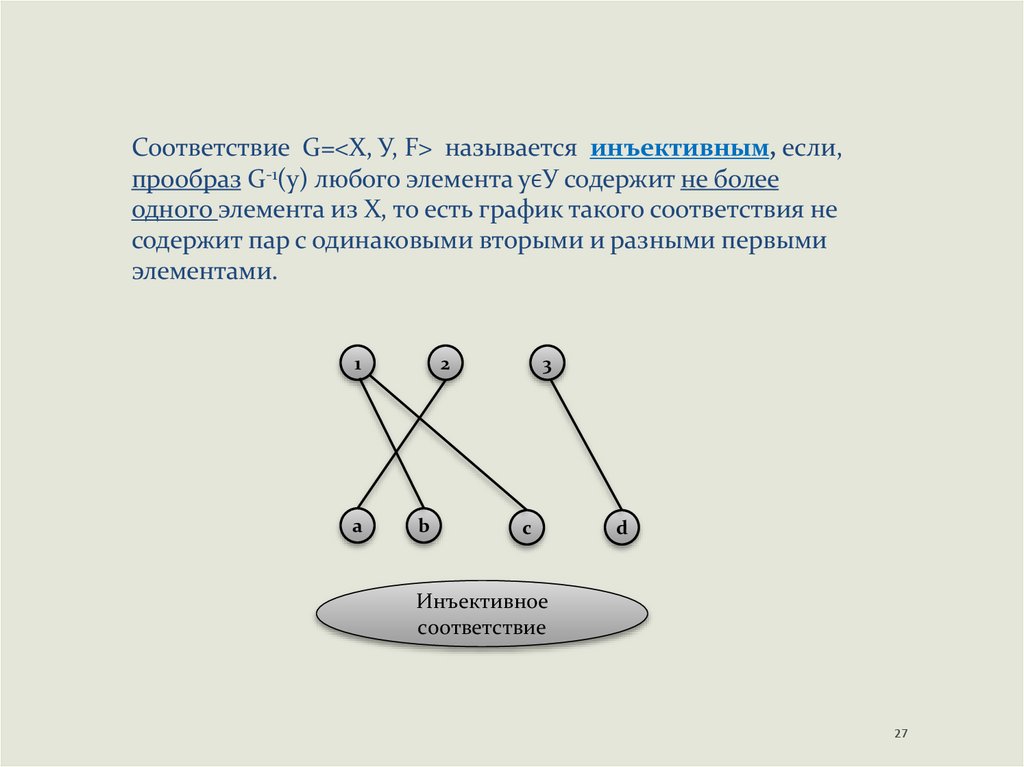 Соответствие G=<Х, У, F> называется инъективным, если,прообраз G-1(у) любого элемента уϵУ содержит не более