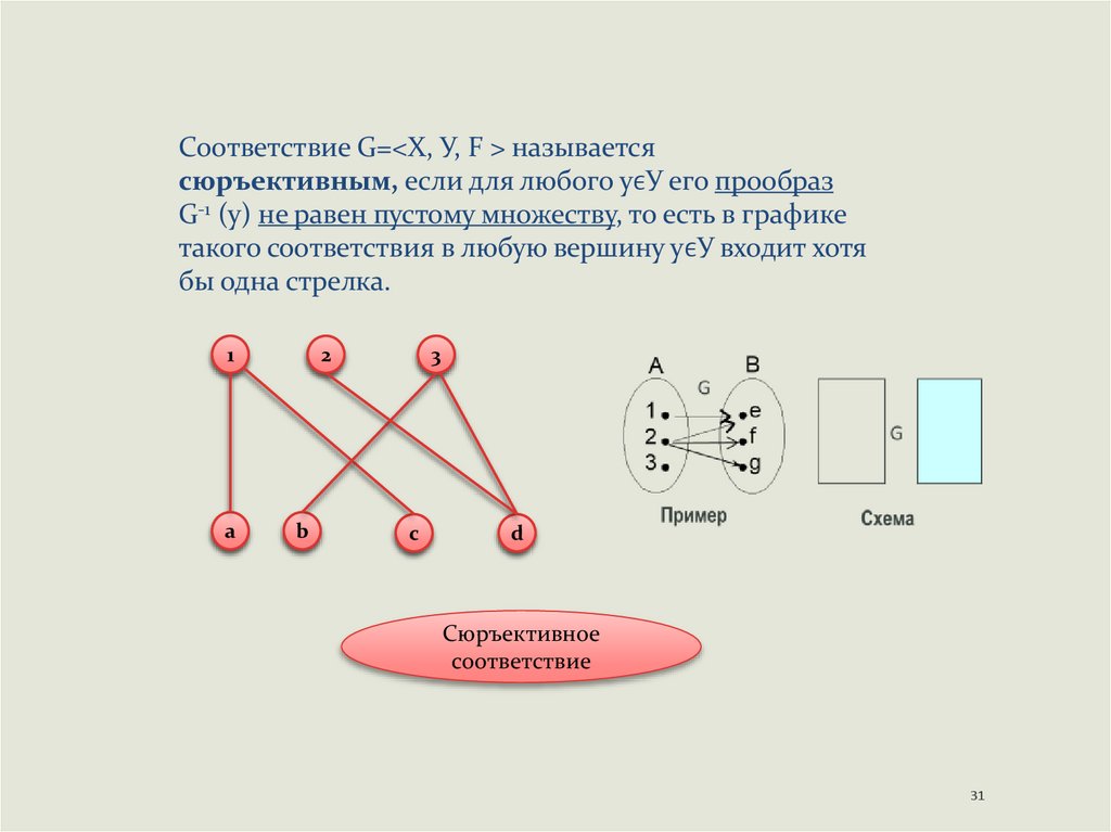Соответствие G=<Х, У, F > называетсясюръективным, если для любого уϵУ его прообраз