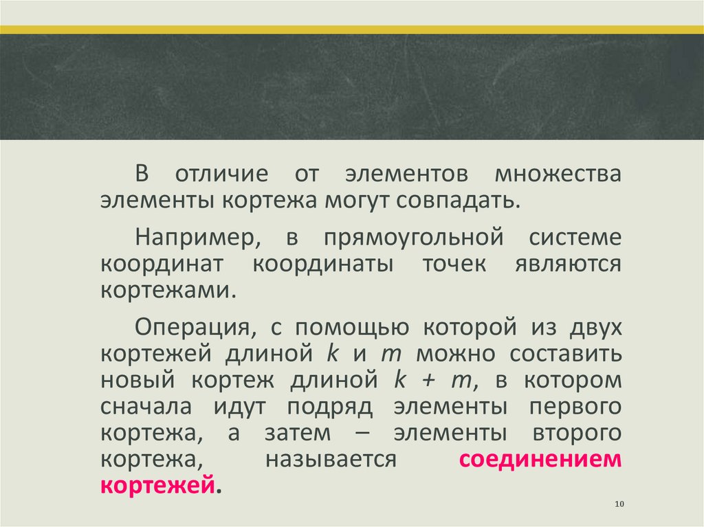 В отличие от элементов множестваэлементы кортежа могут совпадать.