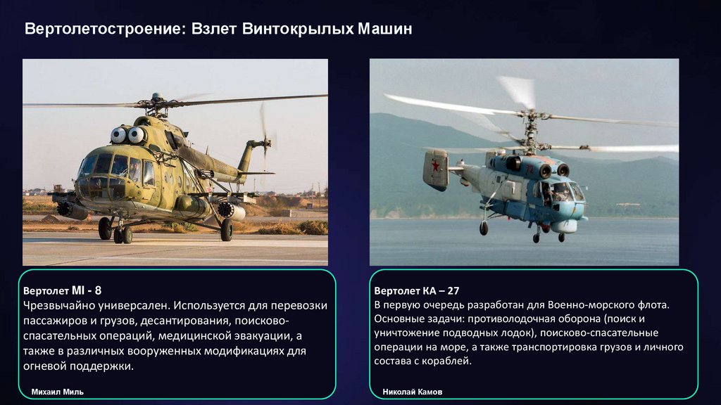 Яковлева, Лавочкина, Микояна, Гуревича, Сухого, Миля, Камова