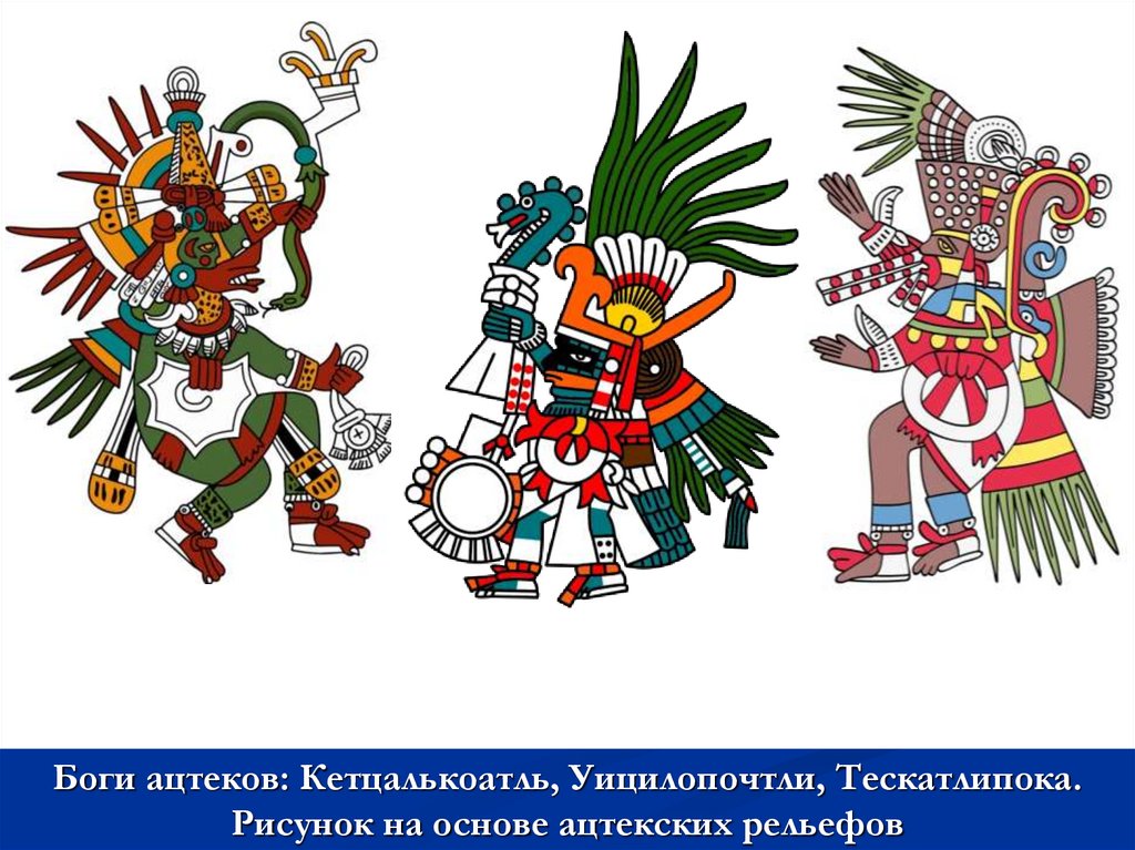 Боги ацтеков: Кетцалькоатль, Уицилопочтли, Тескатлипока.Рисунок на основе ацтекских рельефов