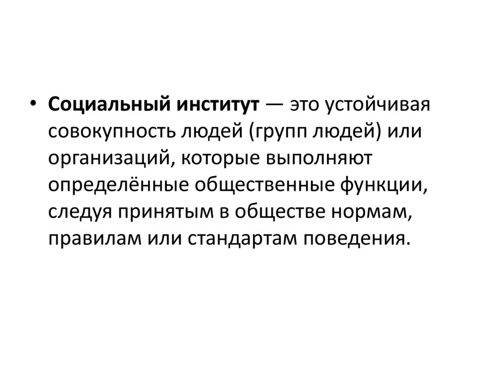 • Социальный институт — это устойчиваясовокупность людей (групп людей) или