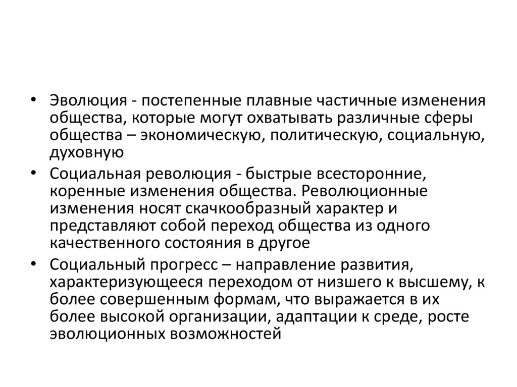 • Эволюция - постепенные плавные частичные измененияобщества, которые могут охватывать различные сферы