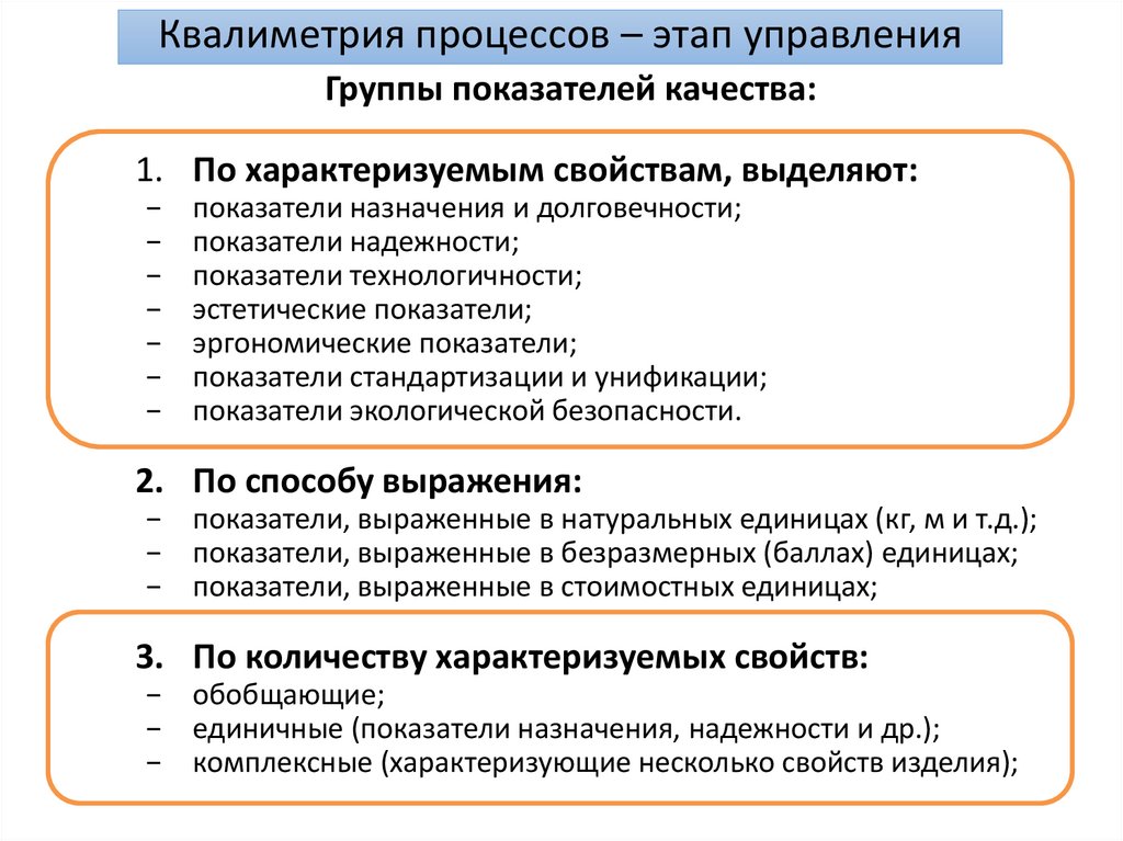 Квалиметрия процессов – этап управленияГруппы показателей качества: