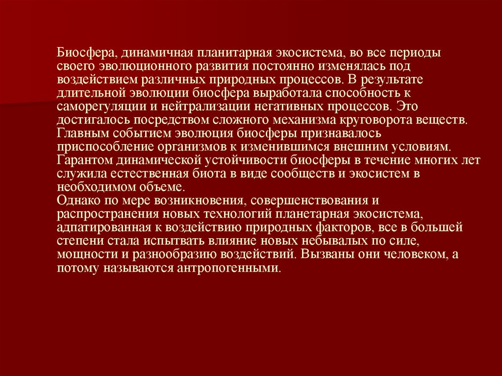 Биосфера, динамичная планитарная экосистема, во все периодысвоего эволюционного развития постоянно изменялась под