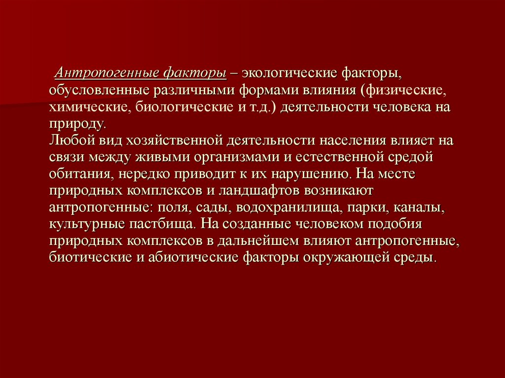 Антропогенные факторы – экологические факторы,обусловленные различными формами влияния (физические,