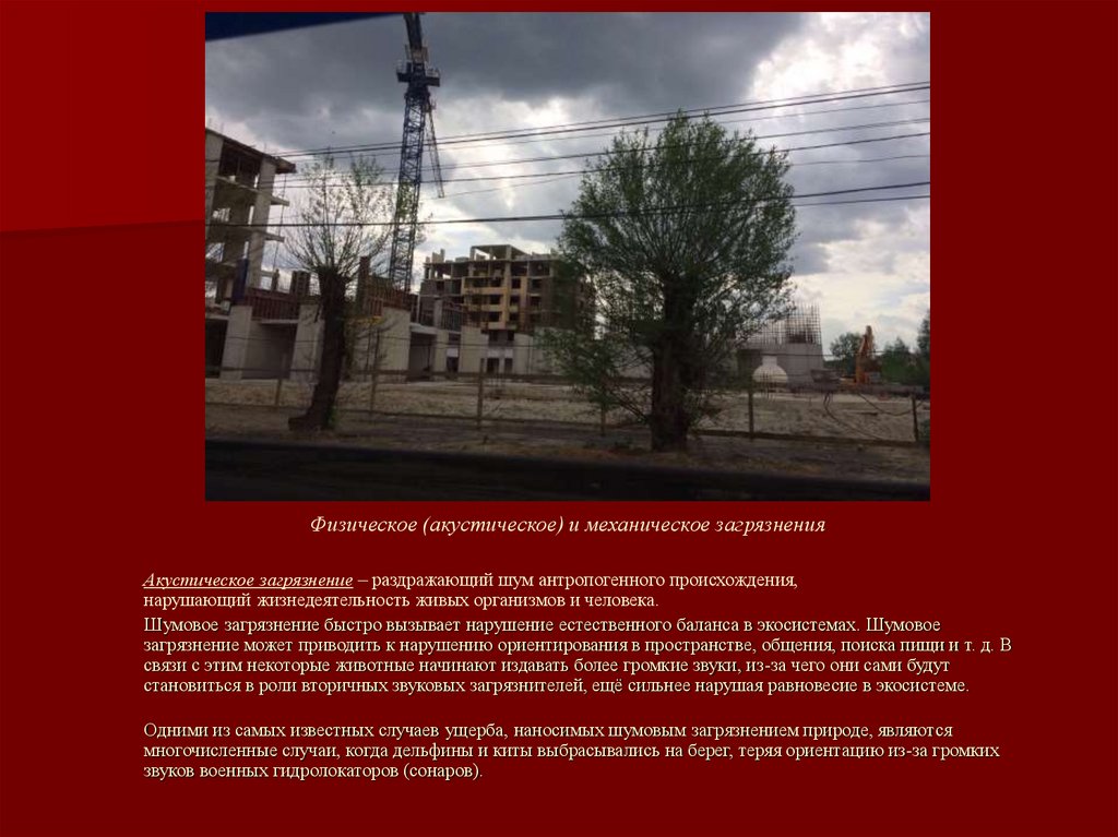 Физическое (акустическое) и механическое загрязненияАкустическое загрязнение – раздражающий шум антропогенного происхождения,