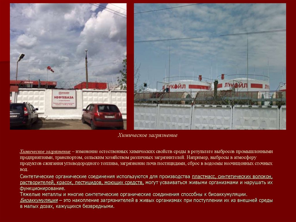 Химическое загрязнениеХимическое загрязнение – изменение естественных химических свойств среды в результате выбросов промышленными