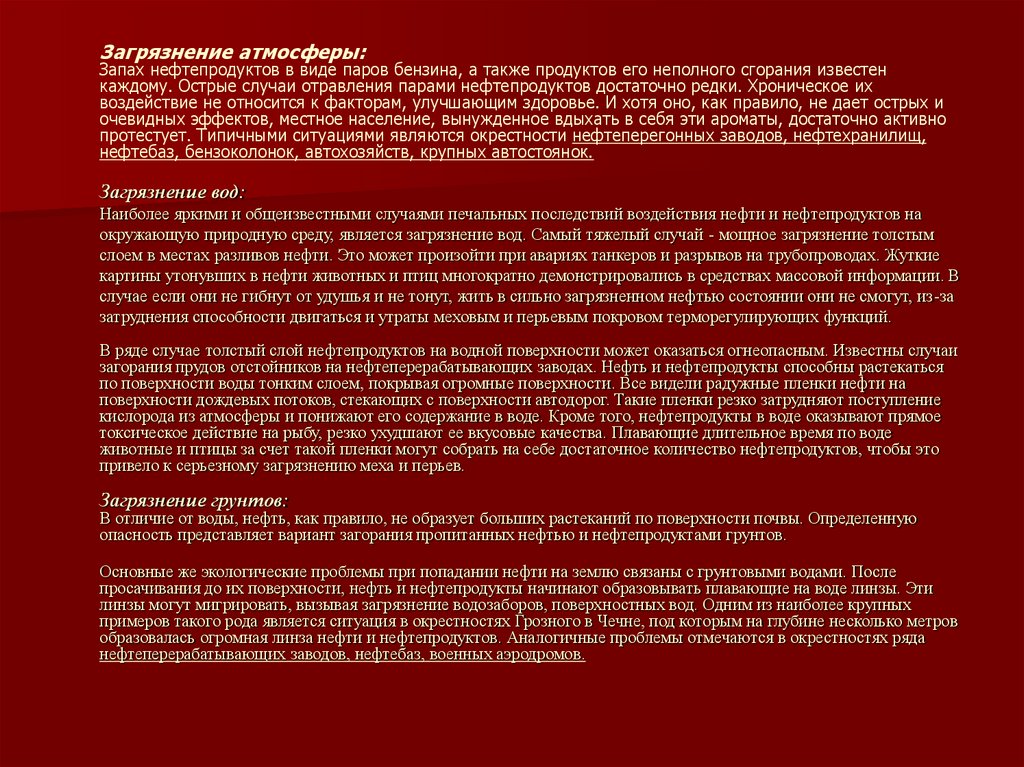Загрязнение атмосферы:Запах нефтепродуктов в виде паров бензина, а также продуктов его неполного сгорания известен