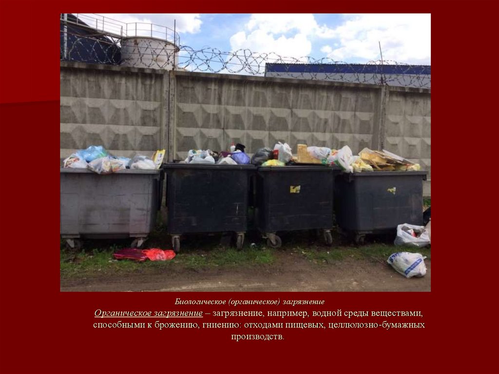 Биологическое (органическое) загрязнениеОрганическое загрязнение – загрязнение, например, водной среды веществами,
