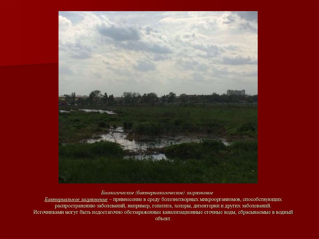 Биологическое (бактериологическое) загрязнениеБактериальное загрязнение – привнесение в среду болезнетворных микроорганизмов, способствующих