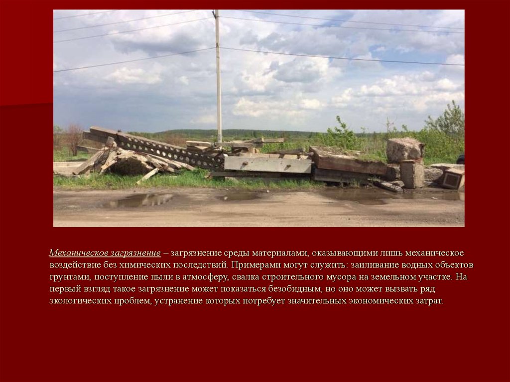 Механическое загрязнение – загрязнение среды материалами, оказывающими лишь механическоевоздействие без химических последствий. Примерами могут служить: заиливание водных объектов