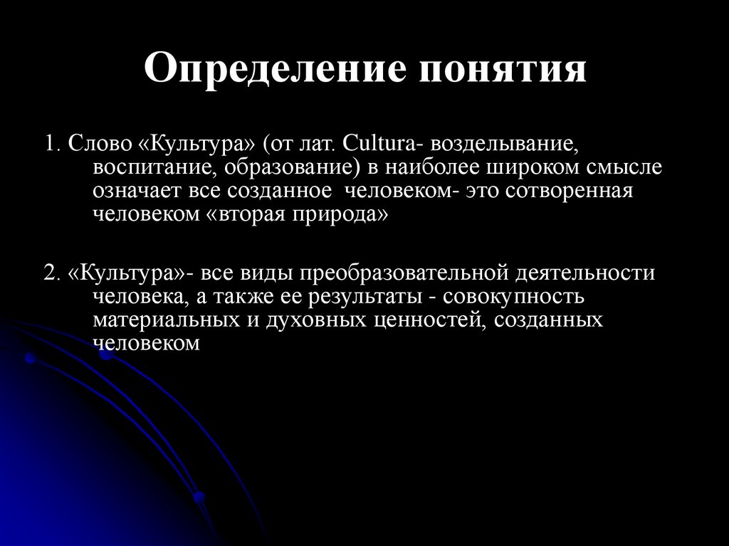 Определение понятия1. Слово «Культура» (от лат. Cultura- возделывание,