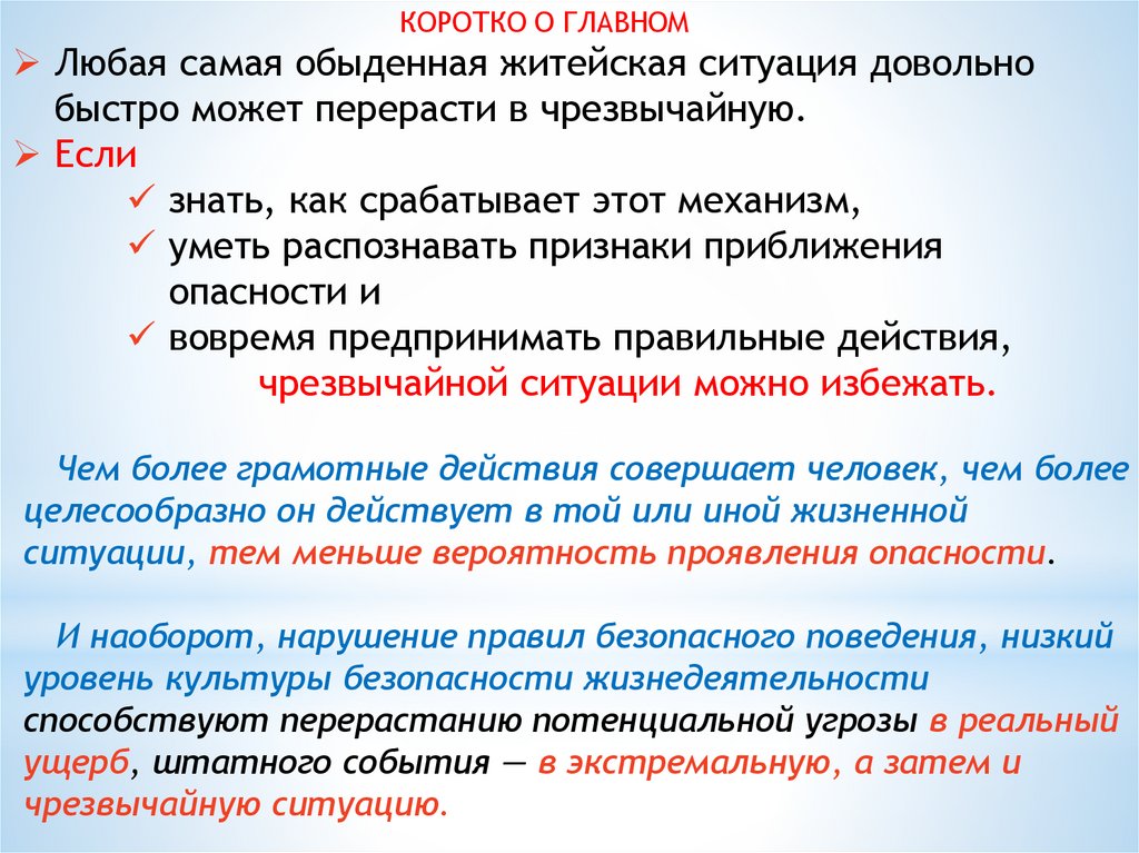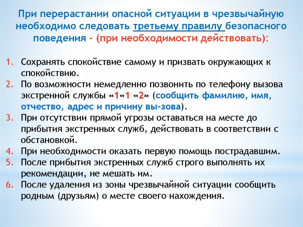 При перерастании опасной ситуации в чрезвычайнуюнеобходимо следовать третьему правилу безопасного