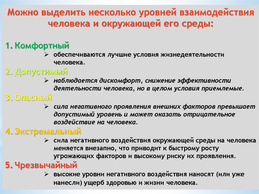 Можно выделить несколько уровней взаимодействиячеловека и окружающей его среды: