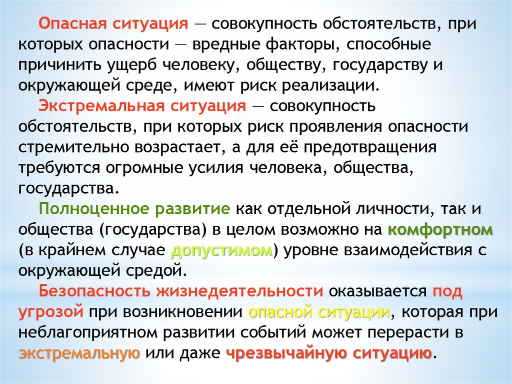 Опасная ситуация — совокупность обстоятельств, прикоторых опасности — вредные факторы, способные