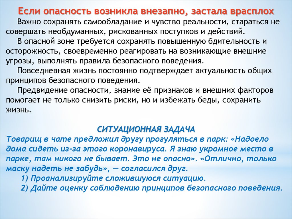 Если опасность возникла внезапно, застала врасплохВажно сохранять самообладание и чувство реальности, стараться не