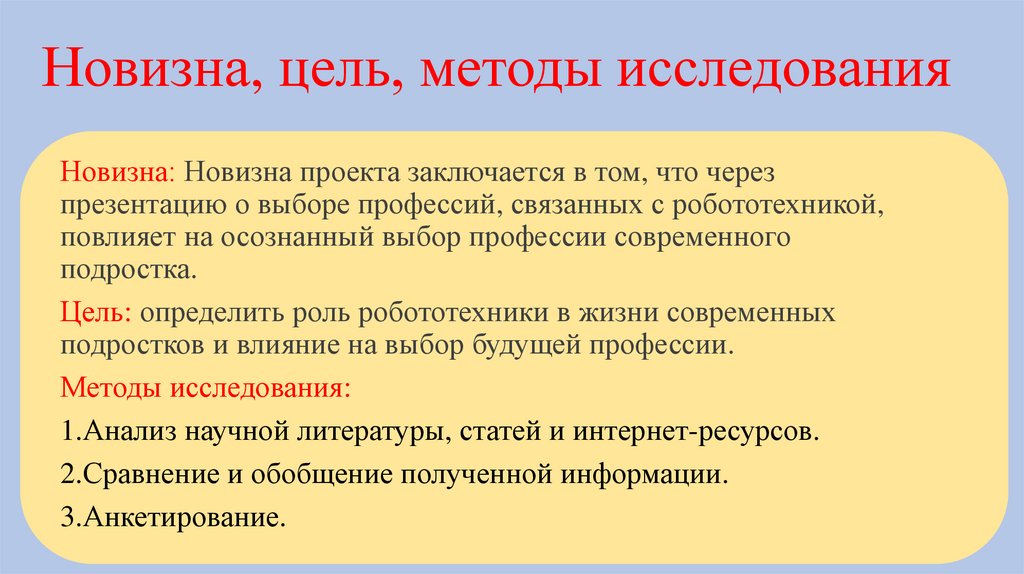 Новизна, цель, методы исследованияНовизна: Новизна проекта заключается в том, что через
