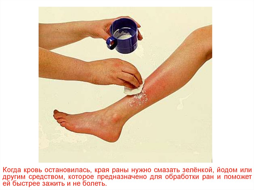 Когда кровь остановилась, края раны нужно смазать зелёнкой, йодом илидругим средством, которое предназначено для обработки ран и поможет