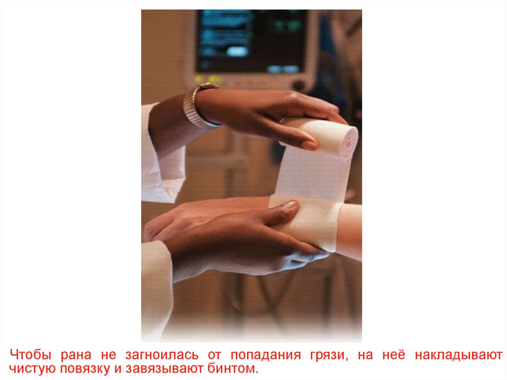 Чтобы рана не загноилась от попадания грязи, на неё накладываютчистую повязку и завязывают бинтом.