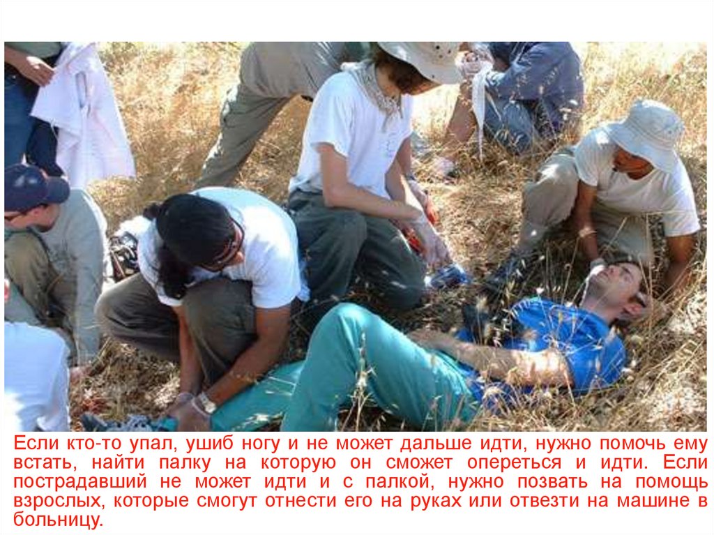 Если кто-то упал, ушиб ногу и не может дальше идти, нужно помочь емувстать, найти палку на которую он сможет опереться и идти. Если