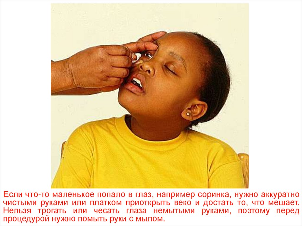 Если что-то маленькое попало в глаз, например соринка, нужно аккуратночистыми руками или платком приоткрыть веко и достать то, что мешает.