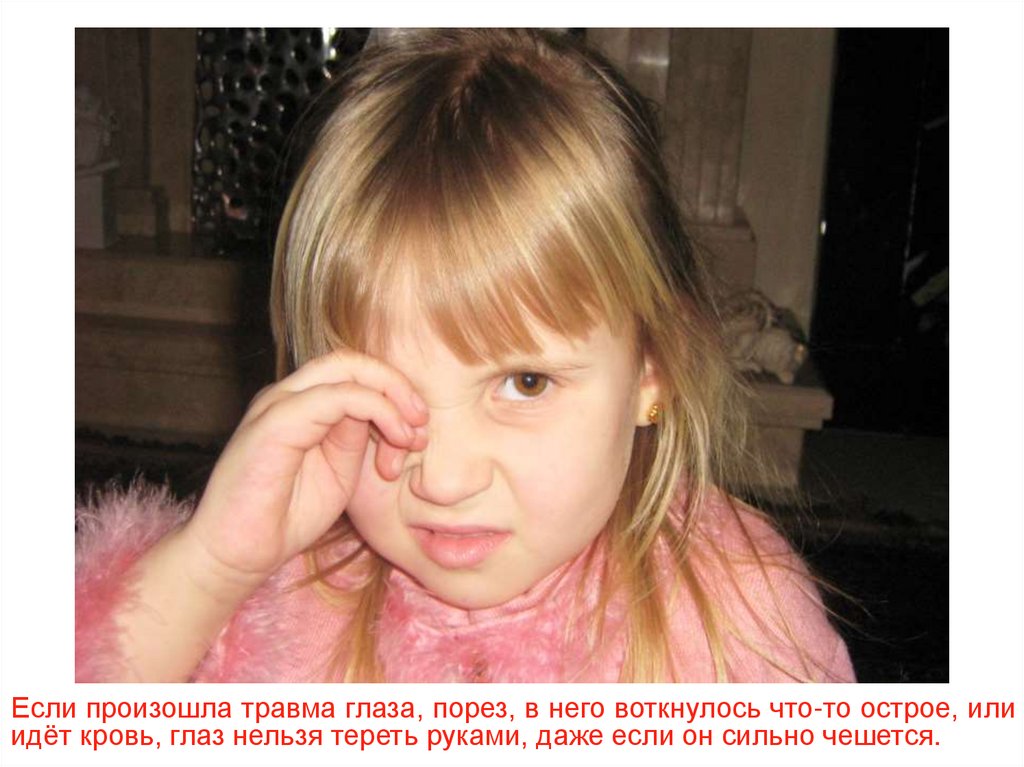 Если произошла травма глаза, порез, в него воткнулось что-то острое, илиидёт кровь, глаз нельзя тереть руками, даже если он сильно чешется.