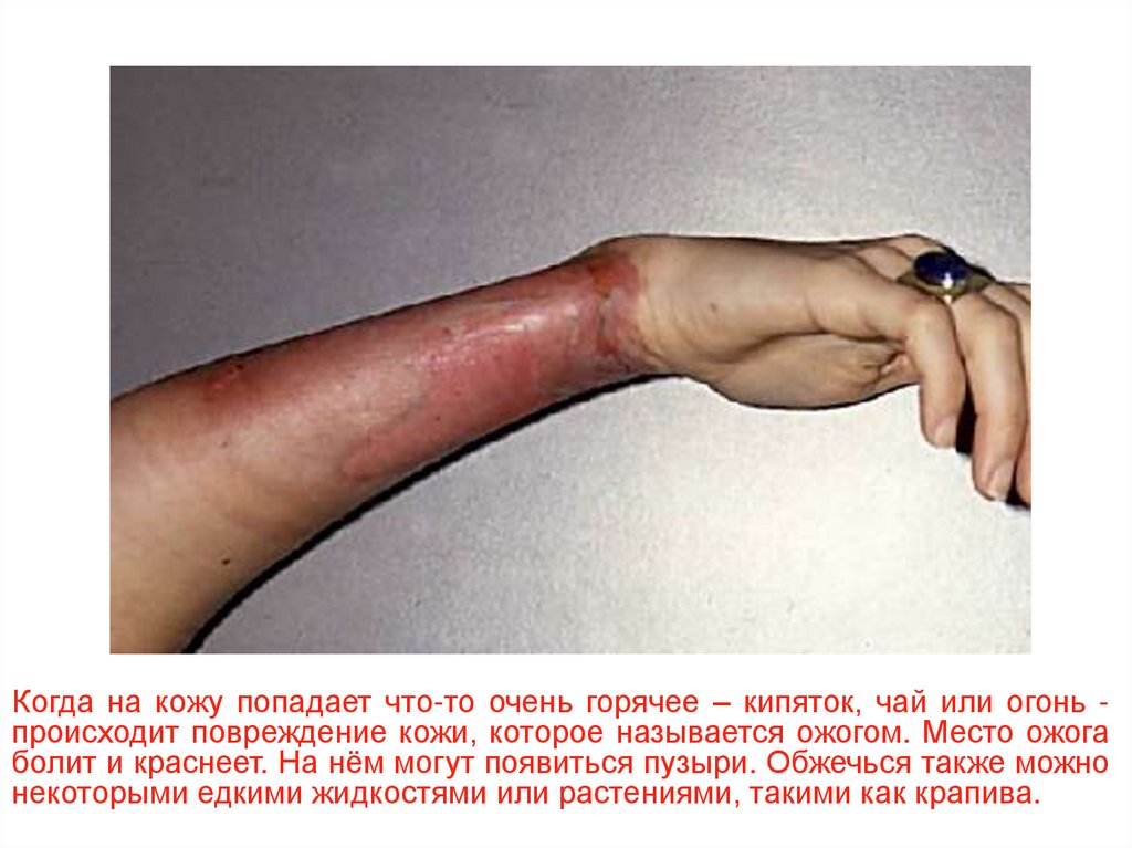 Когда на кожу попадает что-то очень горячее – кипяток, чай или огонь происходит повреждение кожи, которое называется ожогом. Место ожогаболит и краснеет. На нём могут появиться пузыри. Обжечься также можно