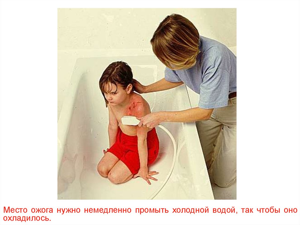 Место ожога нужно немедленно промыть холодной водой, так чтобы оноохладилось.