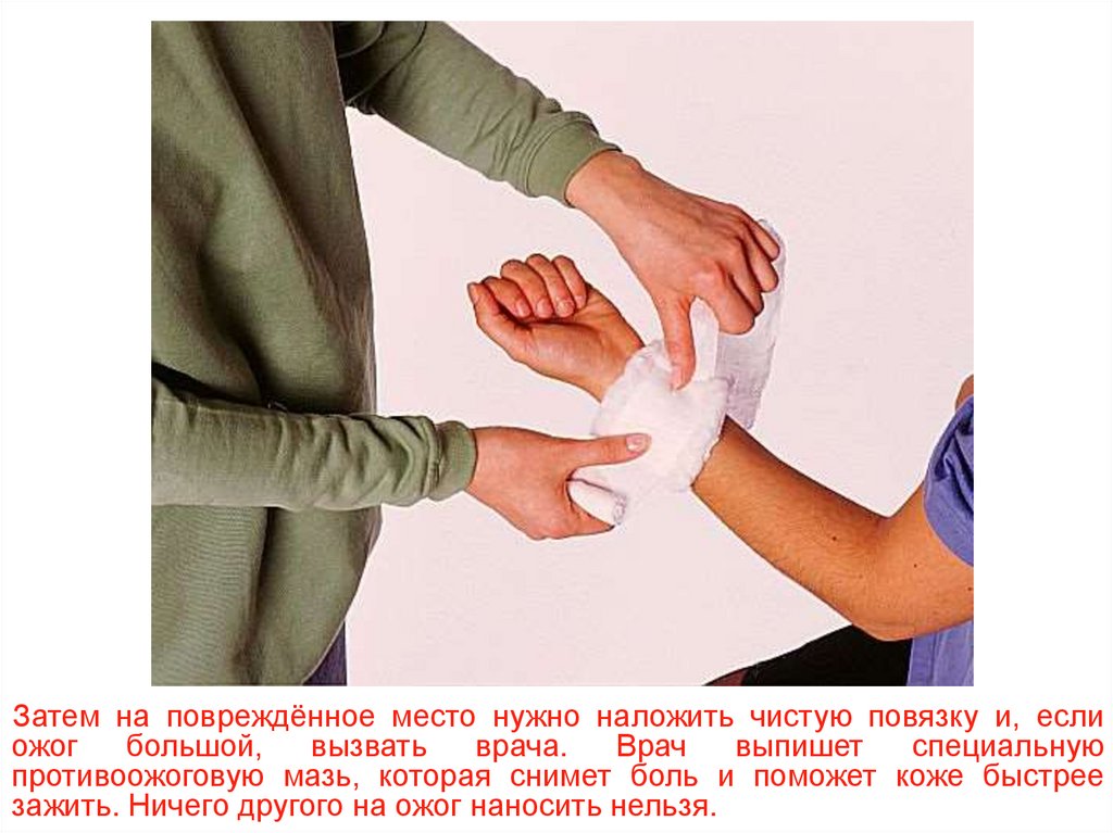 Затем на повреждённое место нужно наложить чистую повязку и, еслиожог