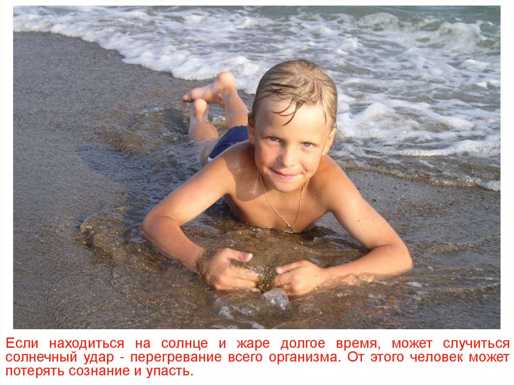 Если находиться на солнце и жаре долгое время, может случитьсясолнечный удар - перегревание всего организма. От этого человек может