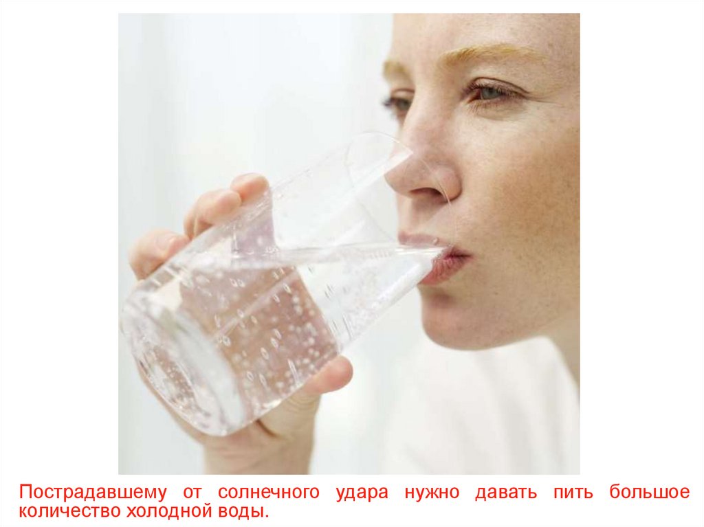 Пострадавшему от солнечного удара нужно давать пить большоеколичество холодной воды.