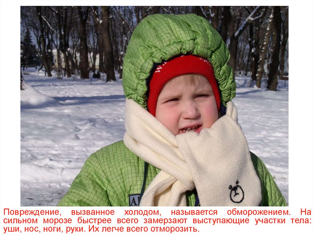 Повреждение, вызванное холодом, называется обморожением. Насильном морозе быстрее всего замерзают выступающие участки тела: