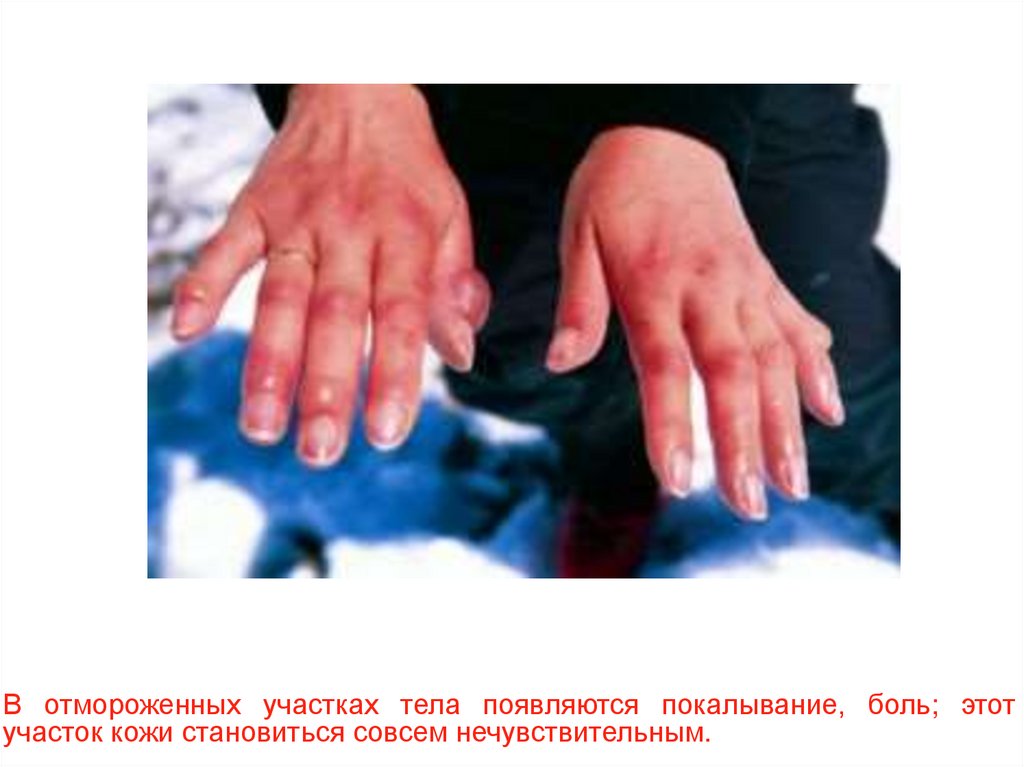 В отмороженных участках тела появляются покалывание, боль; этотучасток кожи становиться совсем нечувствительным.