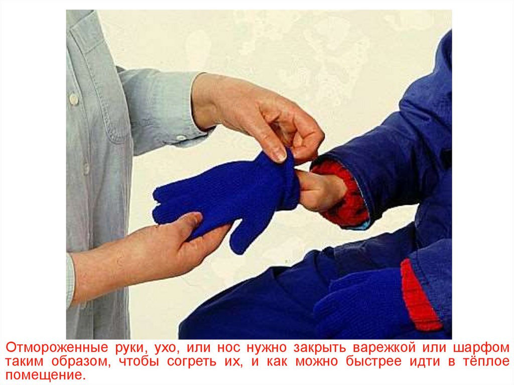 Отмороженные руки, ухо, или нос нужно закрыть варежкой или шарфомтаким образом, чтобы согреть их, и как можно быстрее идти в тёплое