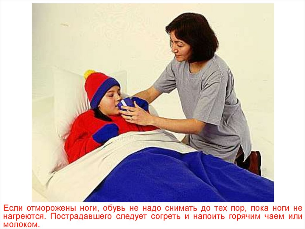 Если отморожены ноги, обувь не надо снимать до тех пор, пока ноги ненагреются. Пострадавшего следует согреть и напоить горячим чаем или