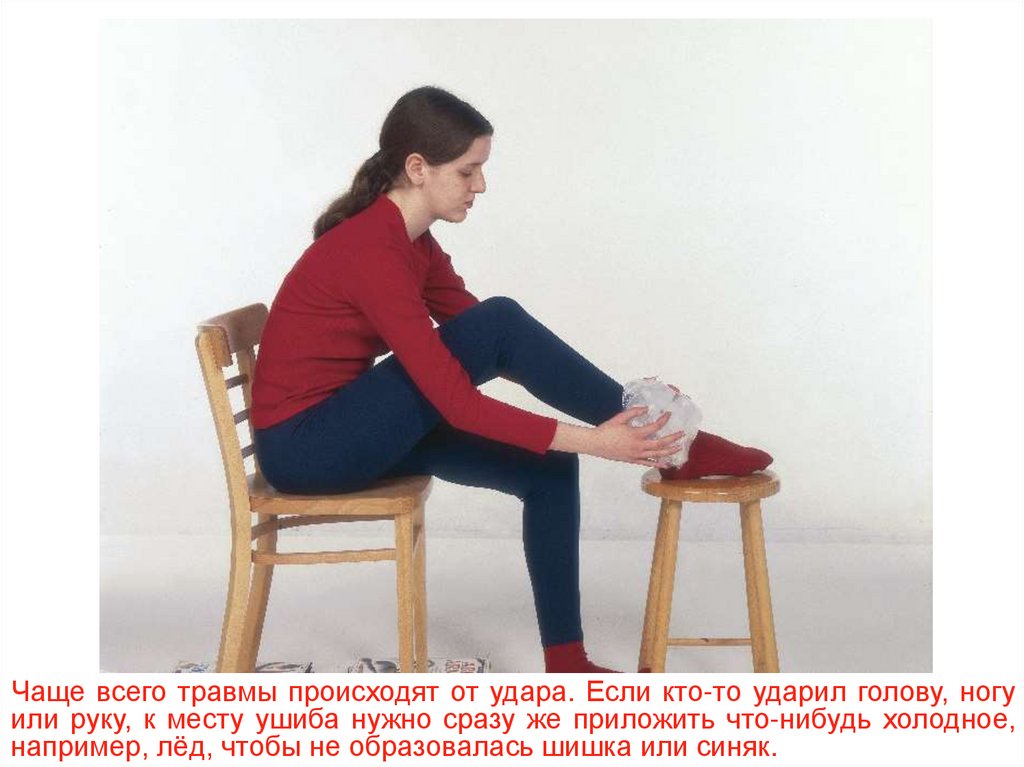 Чаще всего травмы происходят от удара. Если кто-то ударил голову, ногуили руку, к месту ушиба нужно сразу же приложить что-нибудь холодное,