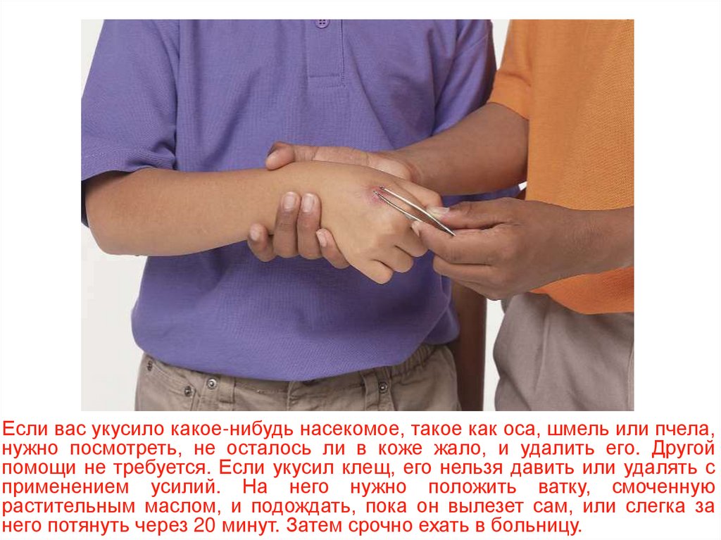 помощи не требуется. Если укусил клещ, его нельзя давить или удалять с